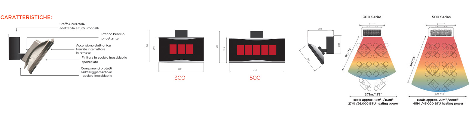 L’installazione orientabile, a soffitto o a parete consente una maggiore versatilità di posizionamento e maggiore ampiezza della superficie riscaldata.